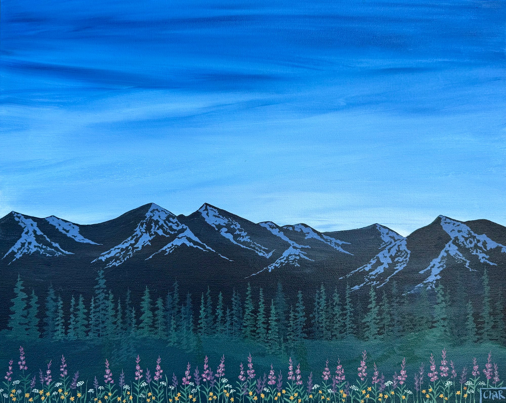 I love looking out to the side of the road to see the highway beautiful lined with an array of colours in the summer months! The wildflowers I painted in this piece are Fireweed (the pink), yarrow (white) and asters (the yellow).